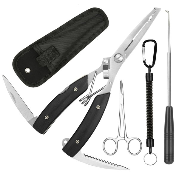• 【3 Pcs portable fishing pliers snips set】Including lanyard & curved fishing forceps & disgorger and nylon sheath, fishing pliers integrate multiple functions such as folding knife and fish scaler. The curved scissors can be used in small spaces or complex environments. The hook remover is used to remove fish hooks safely and quickly to reduce hand injuries