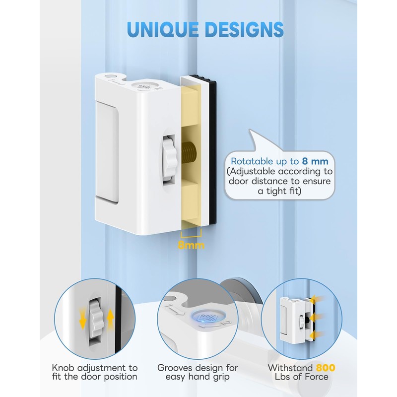 - Adjustable Knob Design: The length of the lock tongue on the safety door lock can be finely adjusted by rotating the knob from 0 to 8mm, easily adapting to different door gap widths. When closed, it tightly adheres to the door panel, paired with a rubber pad to ensure secure locking while preventing door panel scratches