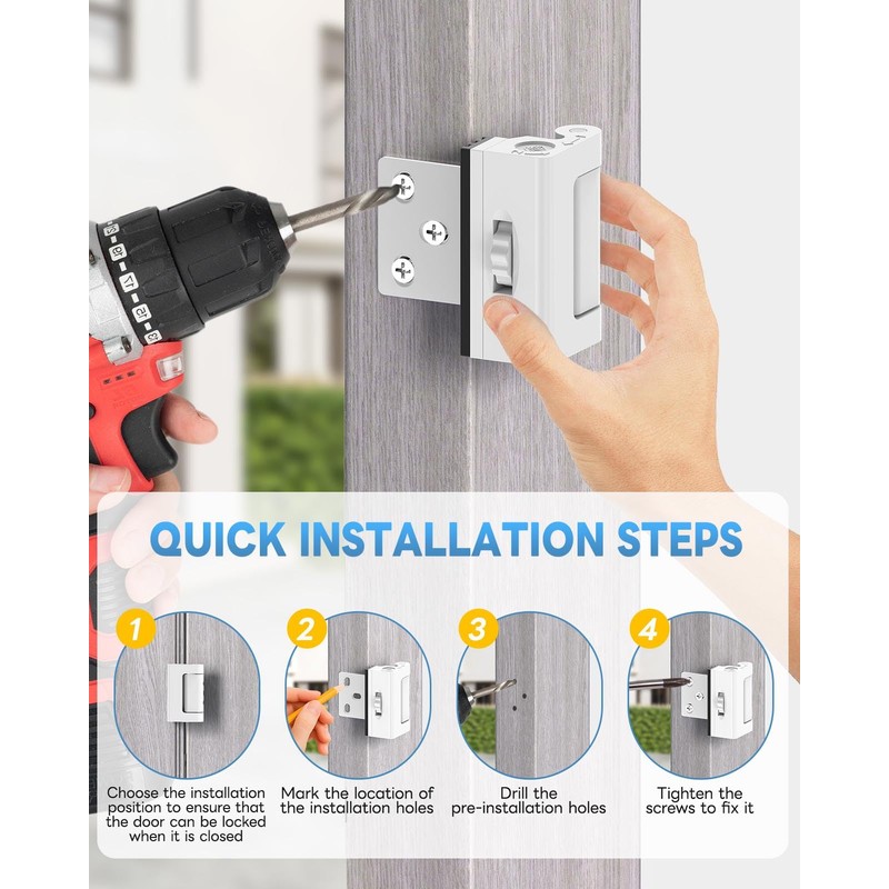 - Easy Installation: You can refer to the installation manual and use a electric drill to install it with the included screws. It can be used as an independent door safety lock or as a reinforcement device for the original door lock. The dual locking mechanism doubles the security level, making it especially suitable for long-term living scenarios