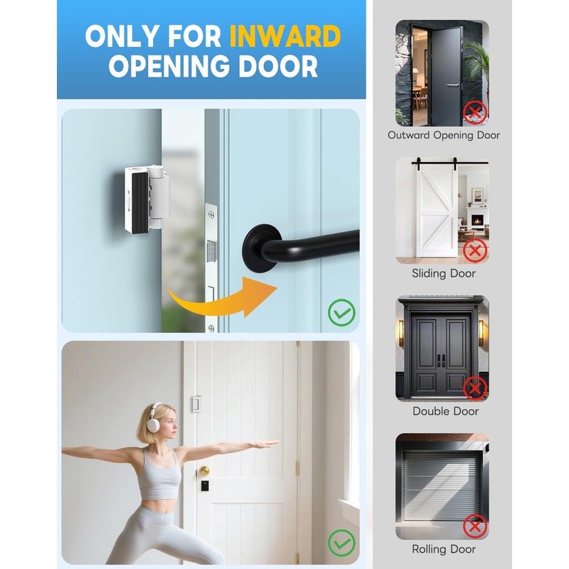 - Wide Range of Door Types: This additional safety door stopper is specifically designed for inward-opening single doors, suitable for residential entrance door, bedroom door, apartment door, hotel room door, etc. Note: Not suitable for outward-opening/sliding/double door, door with gaps less than 0.08 inches