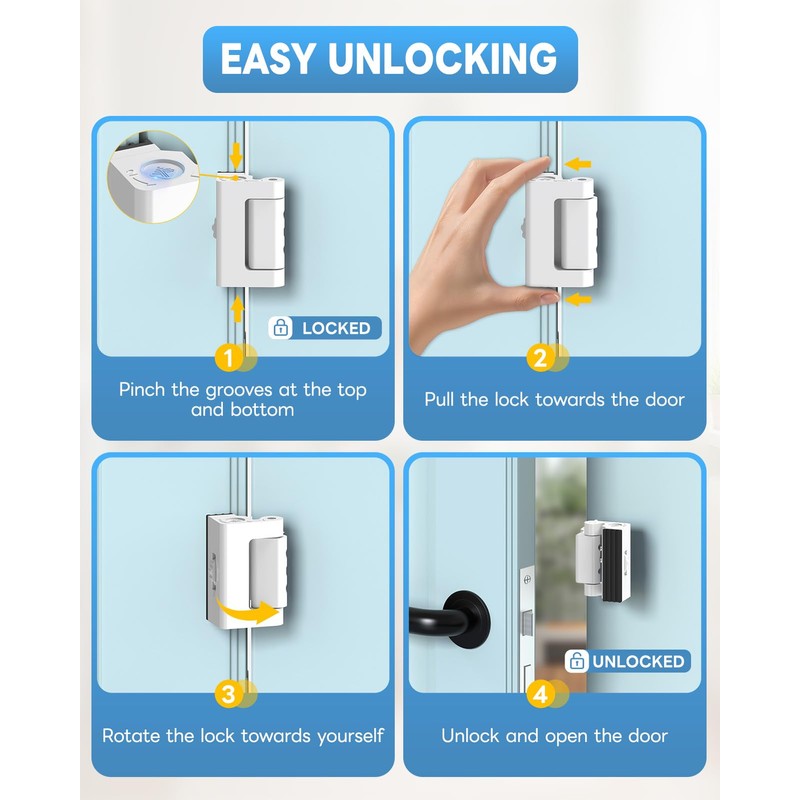 - Easy to Lock & Unlock: To unlock the front door security lock, simply pinch the top and bottom of the lock, slide it toward the door panel, and turn it. To lock, just do the opposite; it's easy to do with one hand