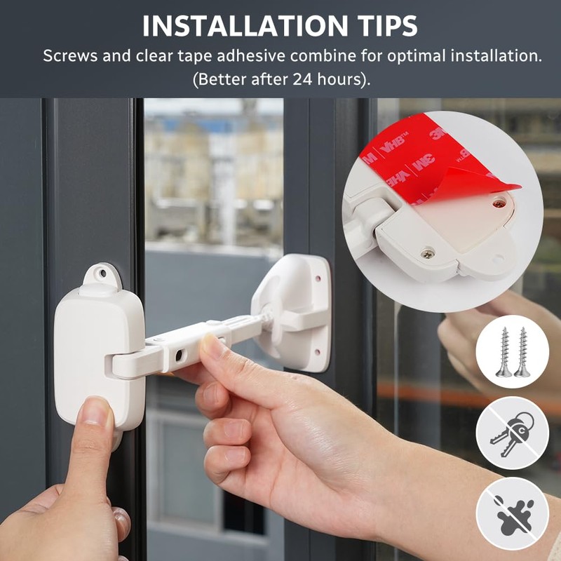 - Non-destructive installation: this window lock is easy to install, no drilling or tools required, built-in 3M VHB secondary adhesive can be easily installed, strong adhesion (better effect after 24 hours), temperature resistance range is -30°C to 90°C. In addition, our window locks have holes at both ends, which can also be mounted with screws, making them stable and high quality