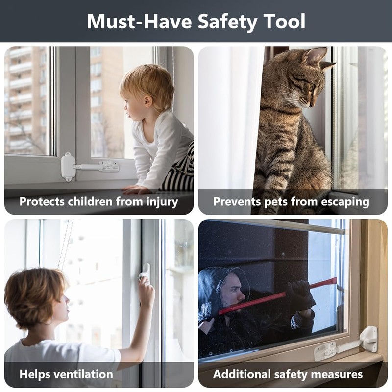 - Wide application: this window safety lock can protect children and pets from injury, prevent pets from jumping out of the window to escape, and enrich your life with a protective lock. It not only has a protective function, but also provides ventilation. Suitable for use with UPVC, wood, metal, aluminum and most common frame windows. Can be used for inward and outward opening windows