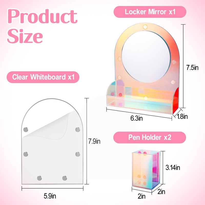 ANPHSIN Iridescent Finish Locker Accessories Set - Includes Acrylic Magnetic Mirror, 2 Pen Holders, Dry Erase Board, Back to School Supplies Locker Decor Organizer for Girls Gifts