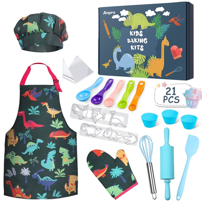 Anpro Children's Cooking Baking Set Role-Plays for Kid Aged +6, Blue Dinosaur Theme Chef Hat Gloves Apron, Cookie Mold Set,Toys for Boys and Girls…