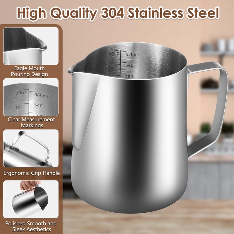 - Nuestra jarra de espuma puede ayudarle a espumar o vapor de leche para lattes, también es perfecta para medir cualquier tipo de líquido, incluyendo leche, té y todos los líquidos que desee.
