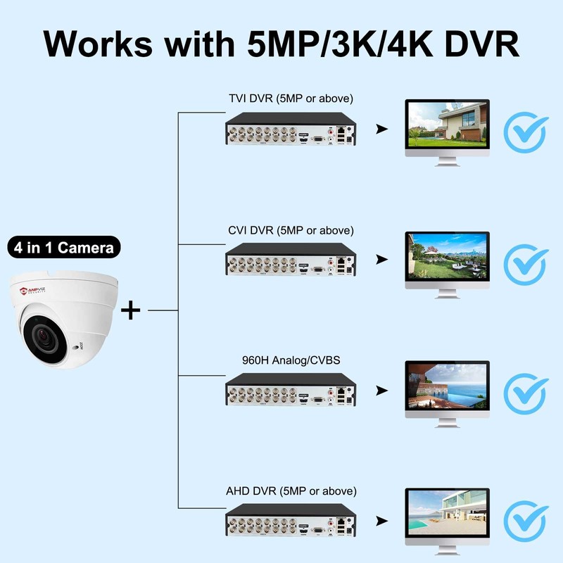 • Compatible with Most Brand CCTV System: This security camera supports 5MP HD-TVI, CVI, AHD and CVBS. Video format can be switched according to your DVR type. It requires a 5MP 3K and 8MP 4K DVR recorder. Can not be used stand alone.