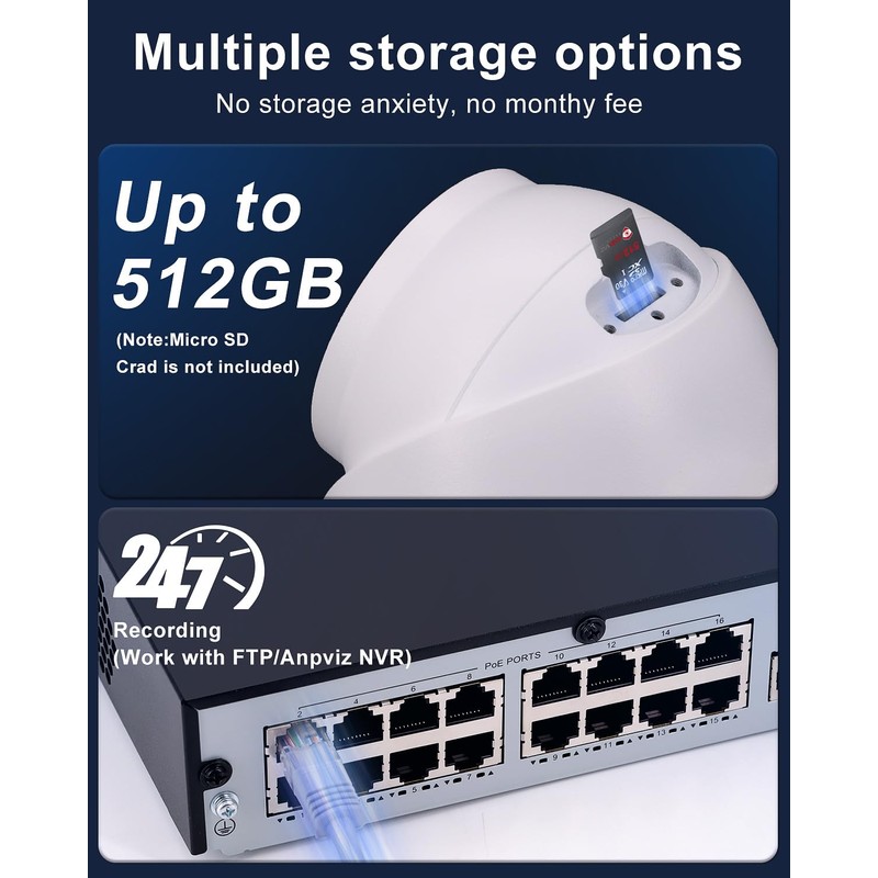 - 100ft Night Vision and Micro SD Card Slot: The wired poe camera features F1.6 super wide aperture, the IR light can capture up to 100ft night vision, making night vision as vivid as day time. This wide angle poe camera is equipped with a micro sd crad slot, you can use up to 512GB sd card to storage the video, less storage worry and help keep 24/7 continuous recording.