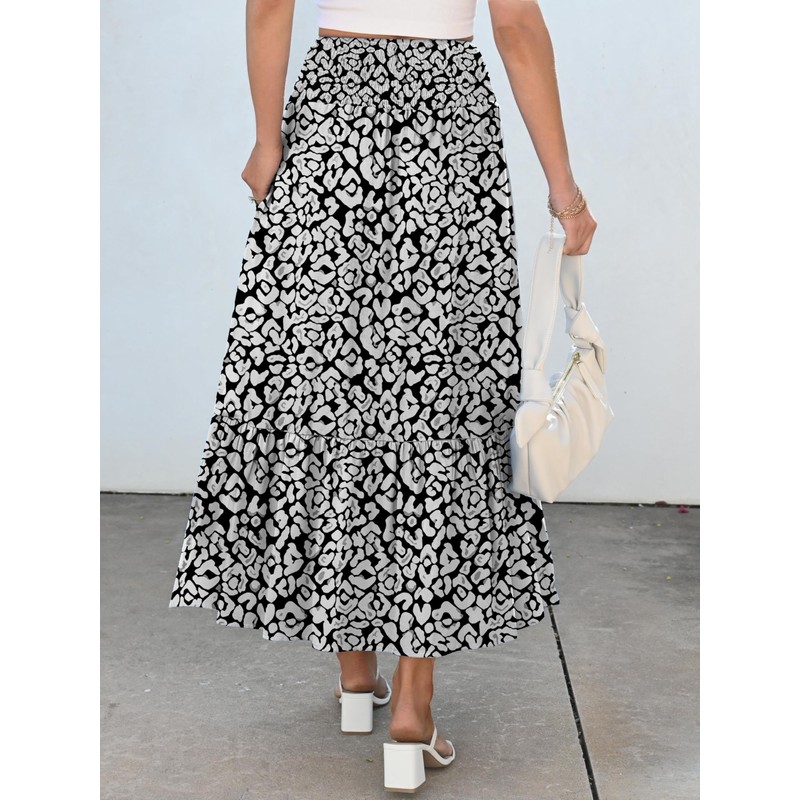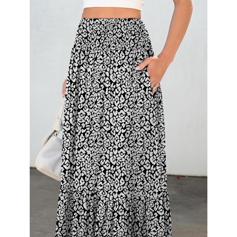 ANRABESS Maxi Skirts for Women 2025 Summer Boho Long Flowy Floral Elastic High Waist Skirt Casual Travel Skirt with Pockets Leopard Print Small