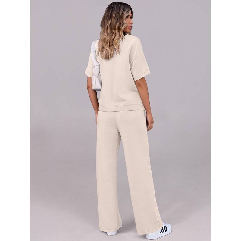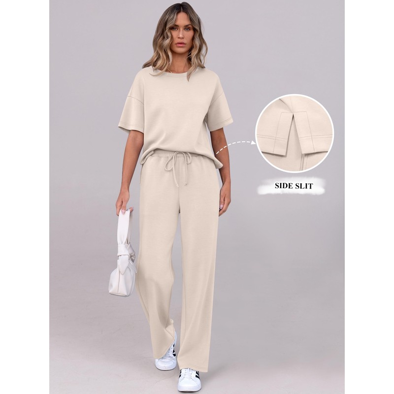 ANRABESS Women's Summer 2 Piece Outfits Casual Short Sleeve Sweatsuits Matching Wide Leg Tracksuits Lounge Sets 2025 Fashion, Apricot, Small