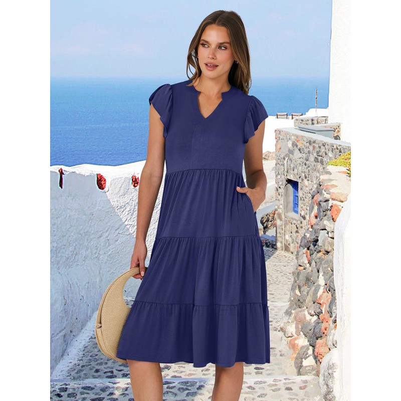 ANRABESS Womens Summer Ruffle Sleeve V Neck Midi Dress 2024 Fashion Casual Fit Flowy Tiered Boho Beach Vacation Sundress Navy Blue-M