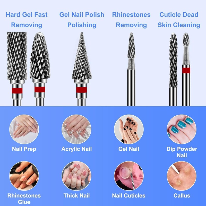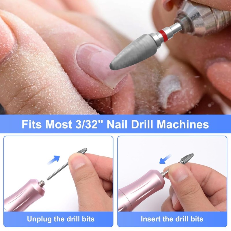 - Premium bits for nail: Made of tungsten carbide with high strength, it is robust and sharp enough to quickly remove hard gel nails. The premium drill bits are heat resistant and protect your skin