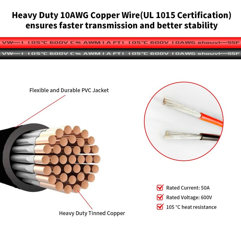 - High Quality 10AWG Copper Wire: this solar panel connectors to sae cable is made of heavy duty 10awg tinned copper wire with larger diameter that can reduce power loss compared with 12awg/14awg. Rated Current: 50A. Rated Voltage: 600V.