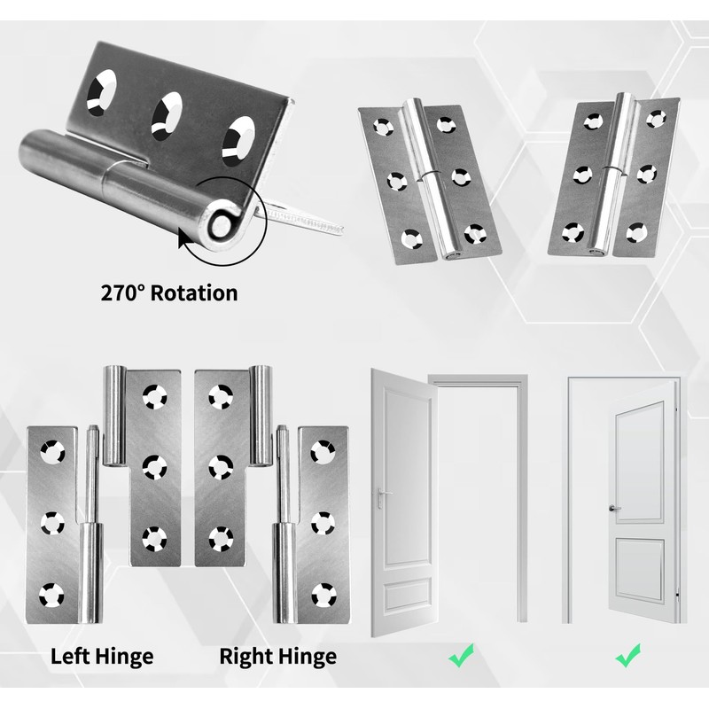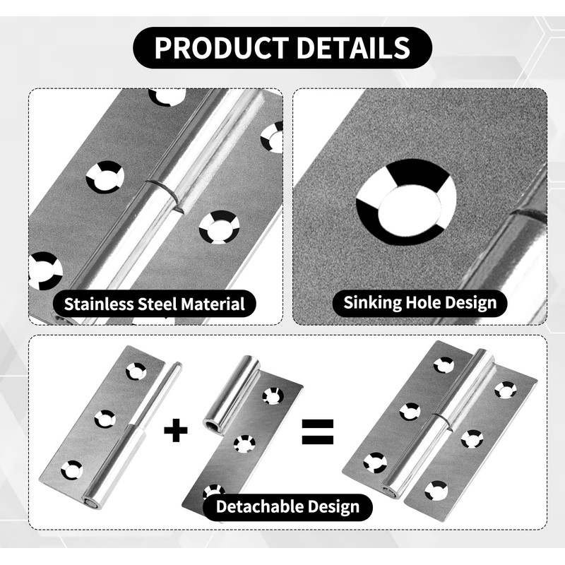 - High-quality material: 4 removable hinges 3 inches (2 hinges left, 2 hinges right). These removable hinges are made of rust-proof 304 stainless steel, which is known for its excellent corrosion resistance and durability. Perfect for use indoors and outdoors where moisture and harsh weather conditions play a role.