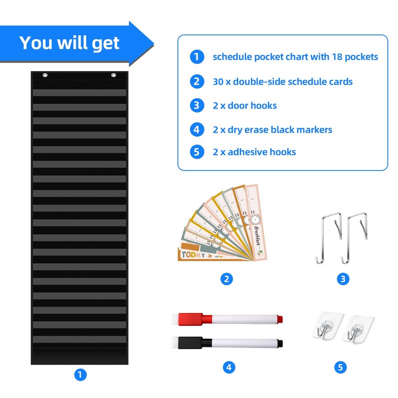 - ※【You Will Get】Including1 pcs of the daily Boho schedule pocket chart with 18+1 pockets,30 pcs double-side reusable schedule cards in total, 2 pieces of adhesive hooks,2 pieces of door hooks.