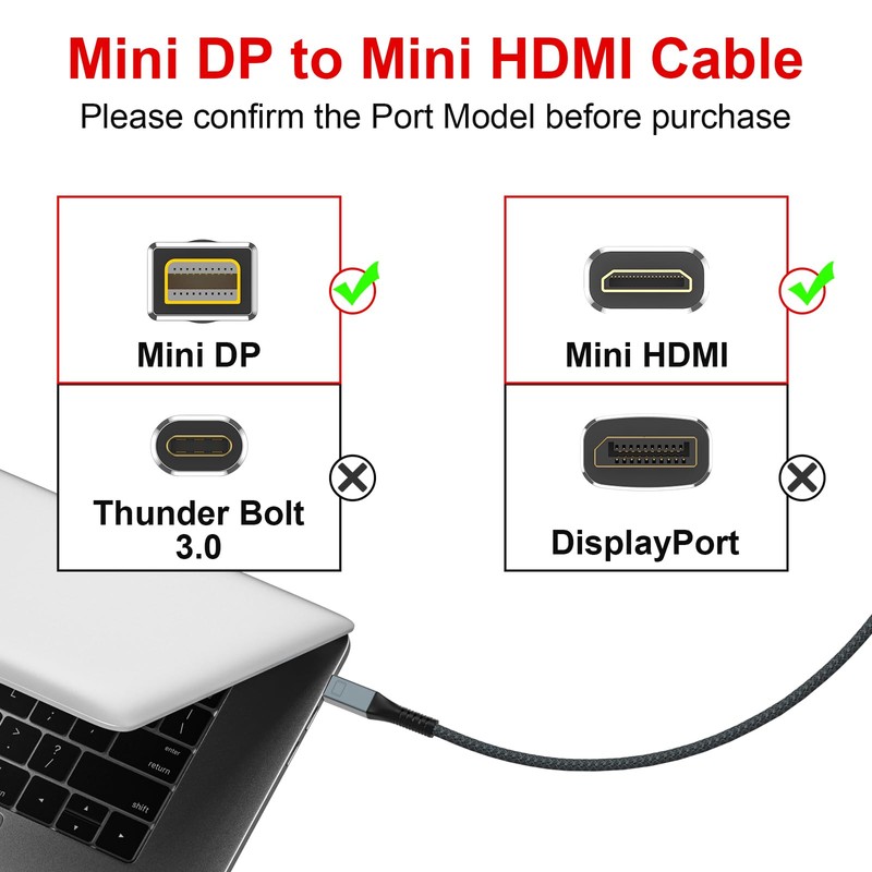 - 【High Reliability】10Ft Mini DisplayPort to Mini HDMI Cable, high-quality build protects against corrosion while maximizing signal strength - 100% Pure copper conductors, Triple Cable Shielding, 24K Gold-plated full metal jacket connectors