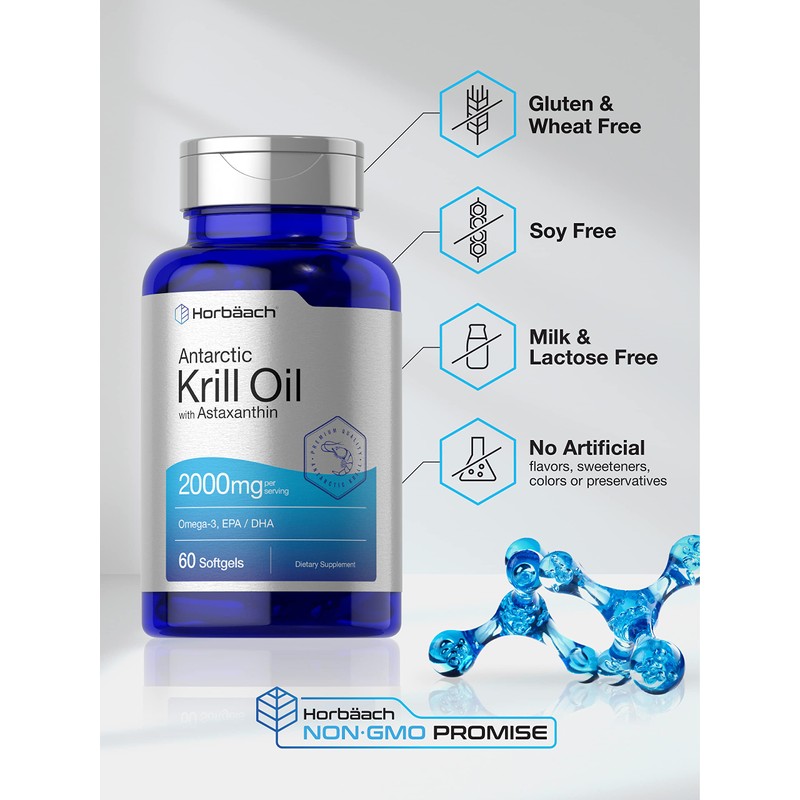 Antarctic Krill Oil 2000mg | 60 Softgel Capsules | Omega-3, EPA, DHA Supplement | with Astaxanthin | Non-GMO, Gluten Free | by Horbaach