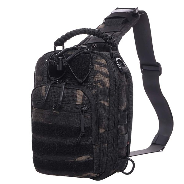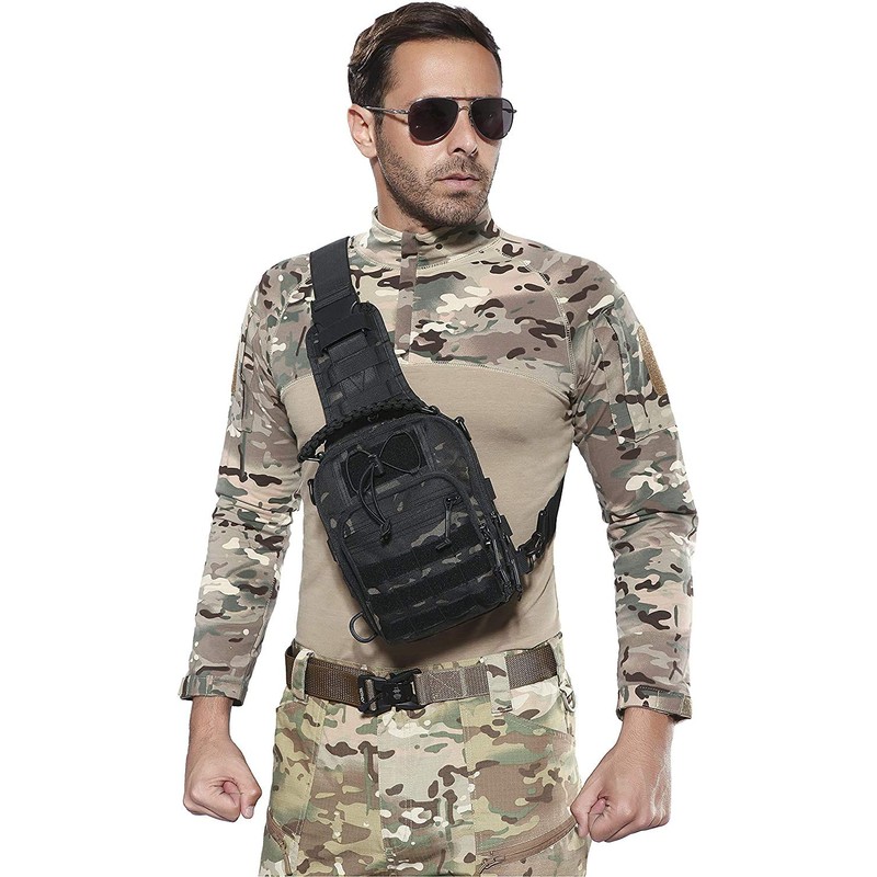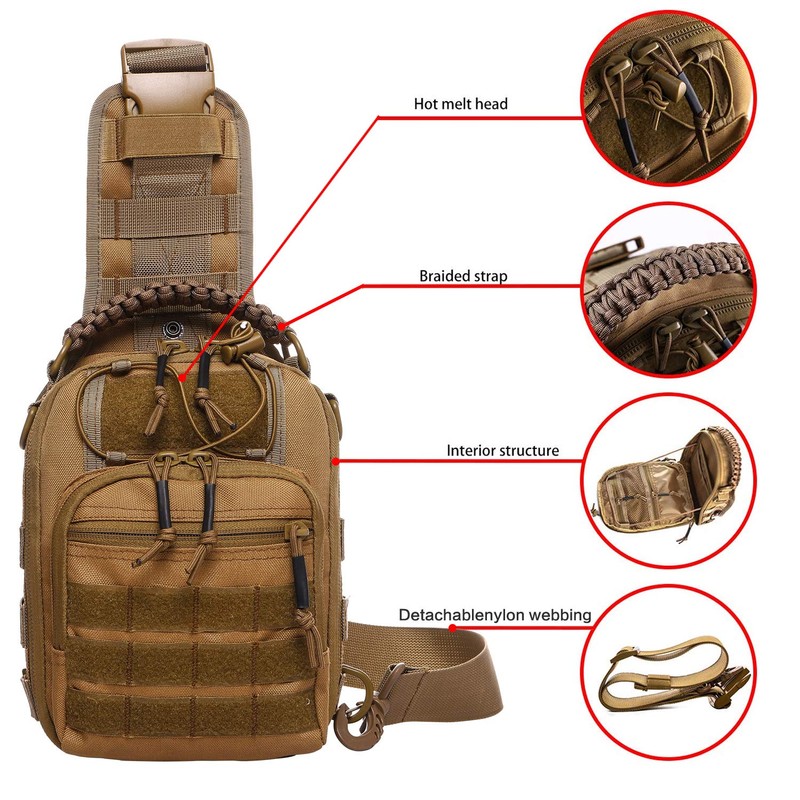 • ☞【HUMANIZED DESIGN】: Tactical sling pack with double-stitched, Heavy duty zippers and utility-style cord pulls. The Handle is made by umbrella rope manual knitting fabric. Adjustable and comfortable single shoulder strap. Molle webbing for attaching addtional tactical pouches, water bottles and emergency tools.