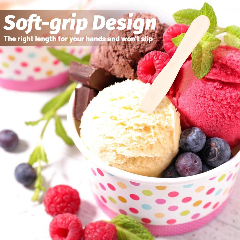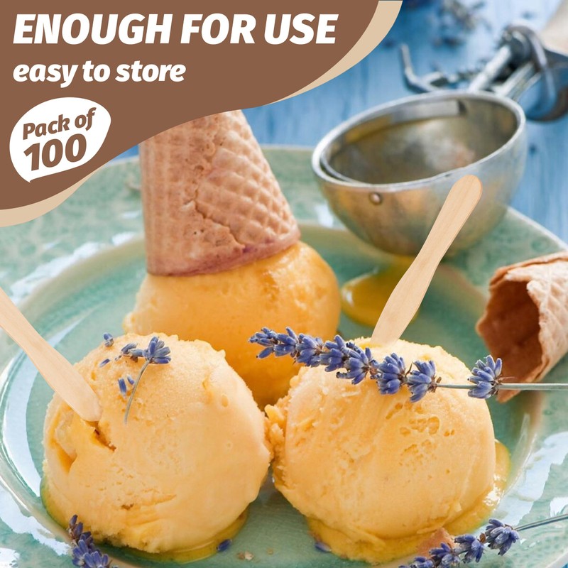 - [PACKAGE INCLUDES]: There are 100pcs 3 inch wooden ice cream spoons in one package, enough for home use. Compact and lightweight packaging, easy to store at home, but also easy to use outside.