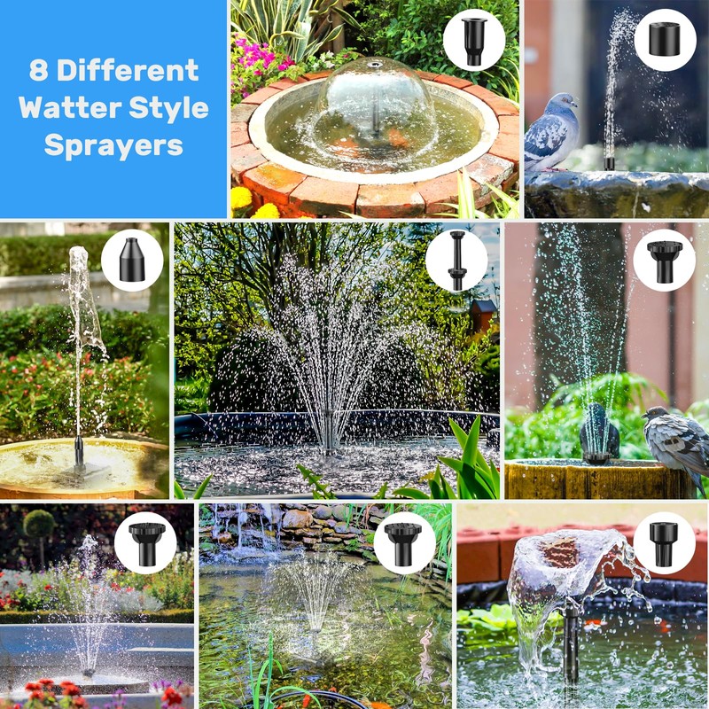 - ☀【8 Spray Modes & DIY Kit】Our solar water pump comes with double-layer modes and 8 different nozzles for different water sprays, you can set the double layer to creating different water features. We also equipped with a 5ft tubing to DIY water features, such as waterfall, bubblers, stream or other DIY water circulation.