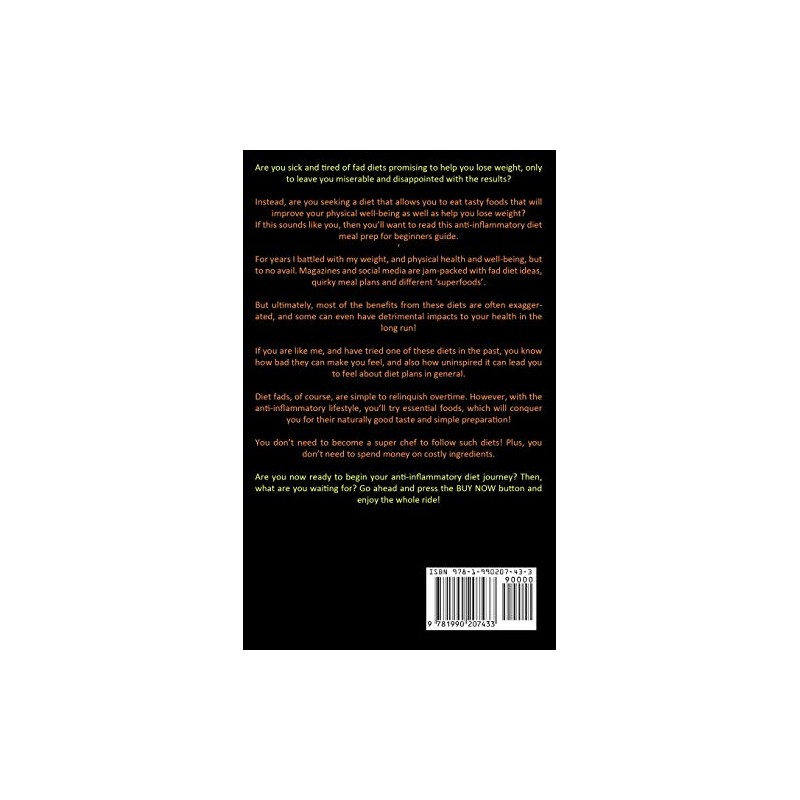 Are you sick and tired of fad diets promising to help you lose weight, only to leave you miserable and disappointed with the results?Instead, are you seeking a diet that allows you to eat tasty foods that will improve your physical well-being as well as help you lose weight?If this sounds like you, then you'll want to read this anti-inflammatory diet meal prep for beginners guide.For years I battled with my weight, and physical health and well-being, but to no avail. Magazines and social media are jam-packed with fad diet ideas, quirky meal plans and different 'superfoods'.But ultimately, most of the benefits from these diets are often exaggerated, and some can even have detrimental impacts to your health in the long run!If you are like me, and have tried one of these diets in the past, you know how bad they can make you feel, and also how uninspired it can lead you to feel about diet plans in general.Diet fads, of course, are simple to relinquish overtime. However, with the anti-inflammatory lifestyle, you'll try essential foods, which will conquer you for their naturally good taste and simple preparation!You don't need to become a super chef to follow such diets! Plus, you don't need to spend money on costly ingredients.Are you now ready to begin your anti-inflammatory diet journey? Then, what are you waiting for? Go ahead and press the BUY NOW button and enjoy the whole ride!