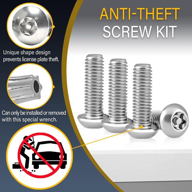 - PREMIUM ANTI-THEFT PROTECTION: The innovative anti-theft screw design ensures your license plate stays securely in place. It can only be removed with the included wrench, making it impossible to tamper with using standard tools. This significantly enhances security, giving you peace of mind