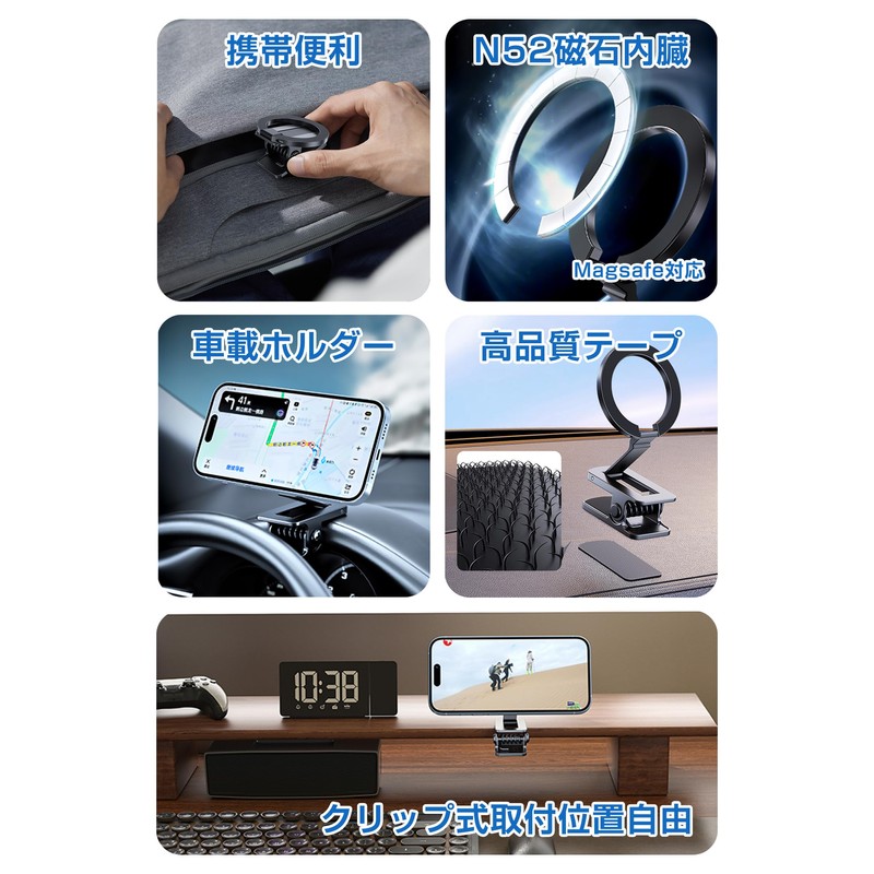 Antion Magnetic Smartphone Holder, Clip Type, Compatible with MagSafe, Velcro Included, Smartphone Stand, Foldable, In-Car Holder, Double Joint Adjustment, Mobile Stand, Tabletop, Car, Travel,