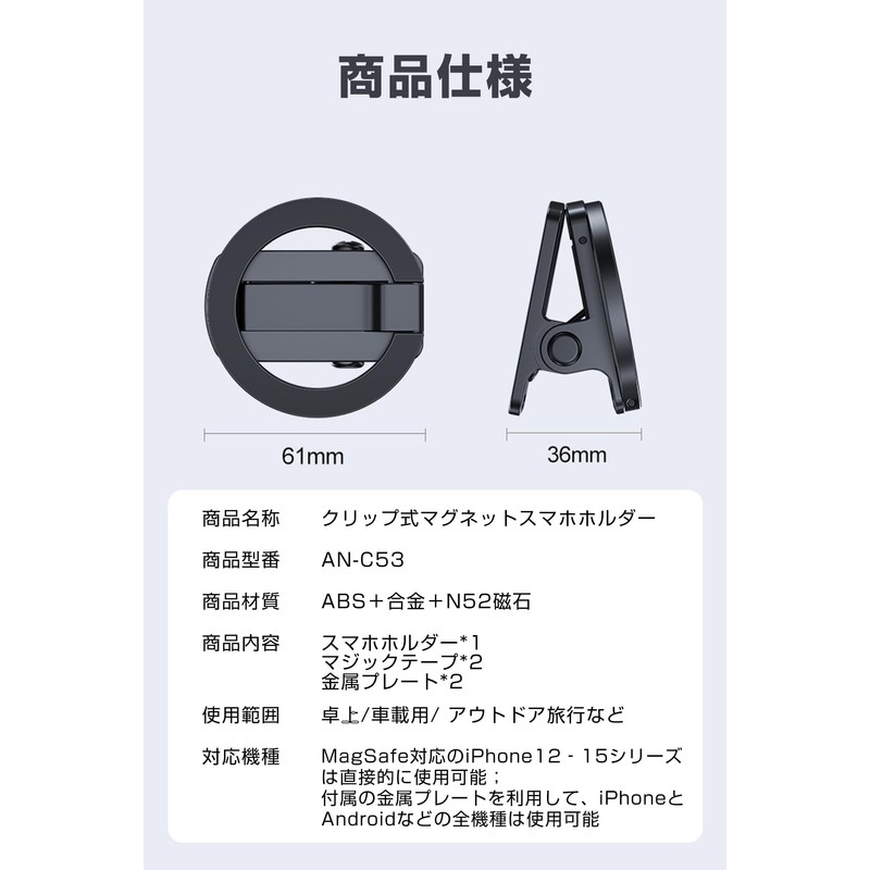 - Compatible with all models: Can be used directly with iPhone 15 14 13 12 series and MagSafe cases. You can also use it with a metal ring for Android smartphones