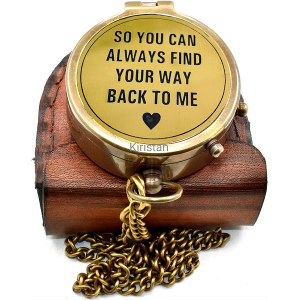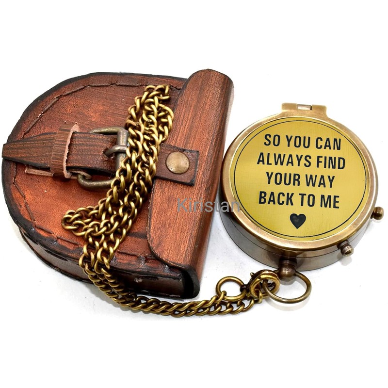 Antique Brass 2 Inch Compass | So You Can Always Find Your Way Back to Me | Engraved Pocket Chain Compass with Leather Case for Outdoor Hiking Traveling Use