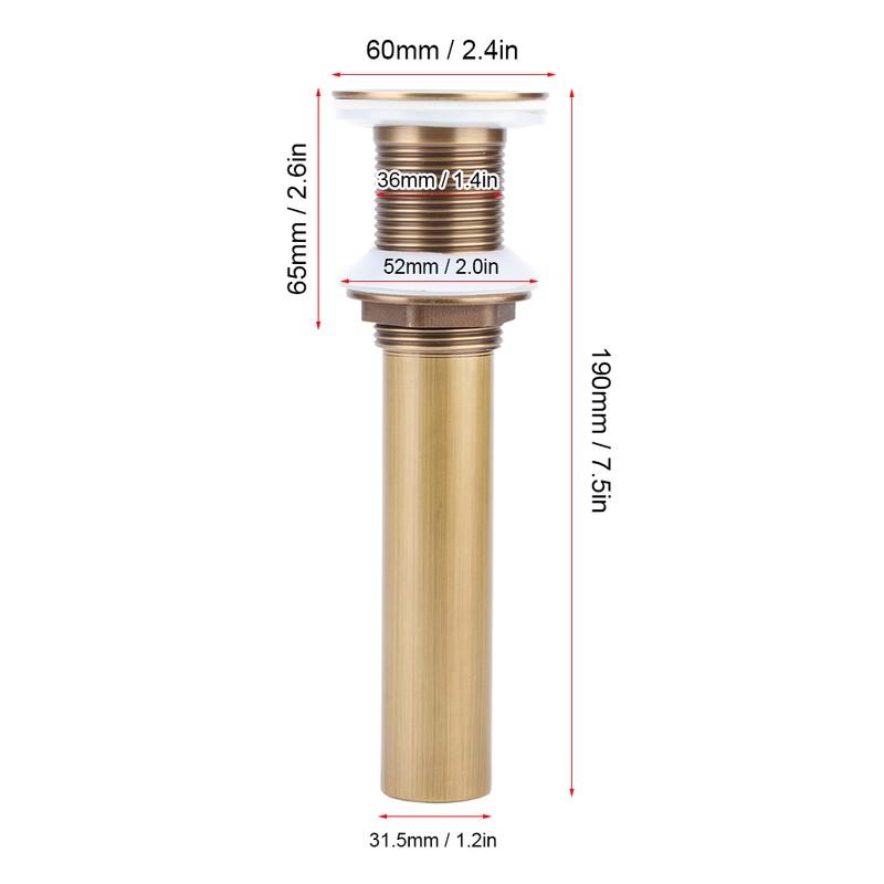 1、Suitable for basin without overflow hole on the basin wall and suitable for 40-45mm mounting hole. 2、Adopting high quality brass material, the basin drain is rust proof, corrosion resistant and wear resistant. 3、Just open and close the basin drain stopper to easily control the drainage and water storage of the bathroom basin. 4、Thickened fixing parts and sealing ring have good toughness and good sealing effect, durable for long time use. 5、It is connected to the lower drain pipe to directly pass through the drainage pipe, practical accessory in bathroom.