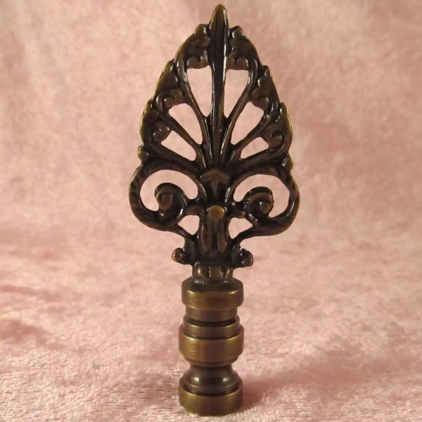 Great reproduction of a very ornate finial ! Heavy cast brass with an antiqued finish. 3 & 3/8" tall. 1/4-27 threads which fits all of your normal lamp harps. Swivel base . PLEASE NOTE THAT THE BASE ON THESE CAN BE KNURLED INSTEAD OF SMOOTH. Depending on what I get shipped.