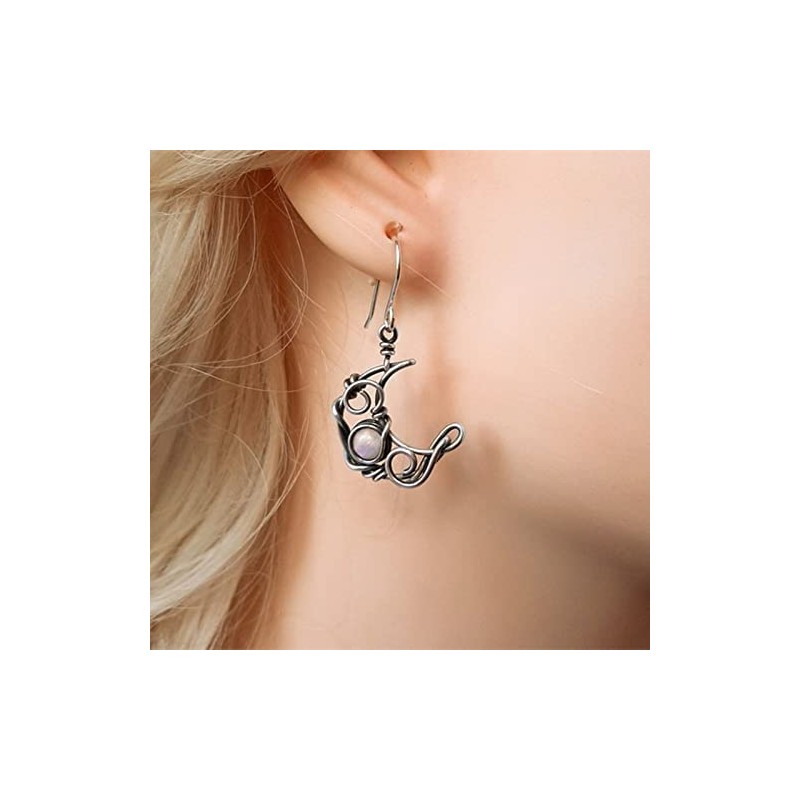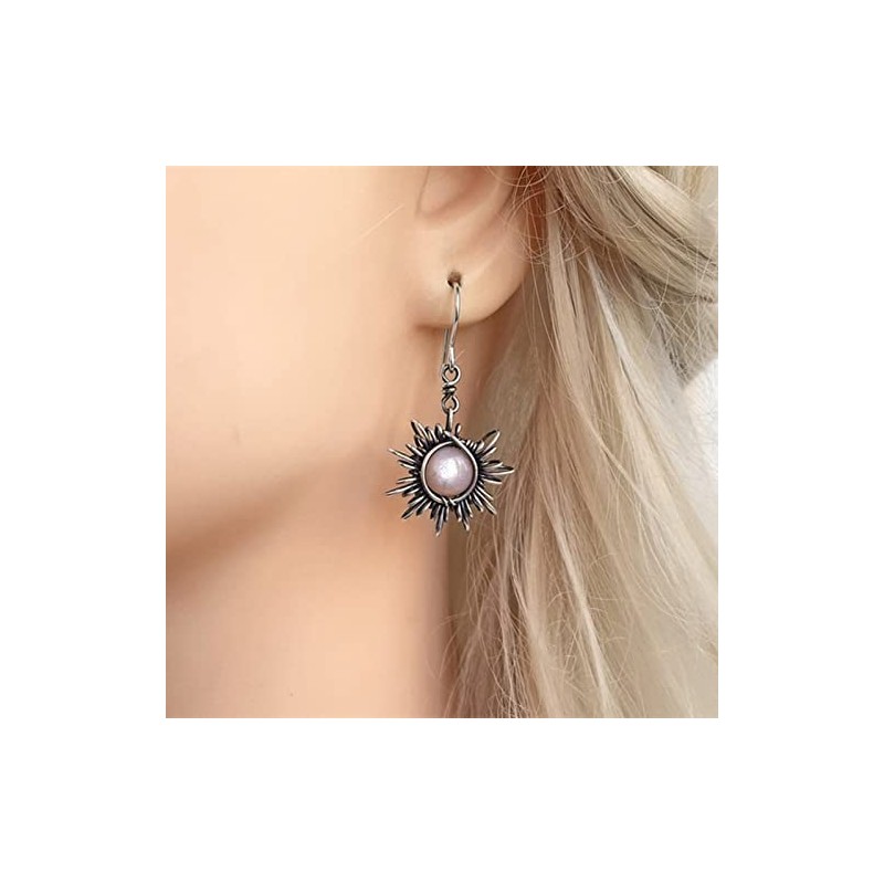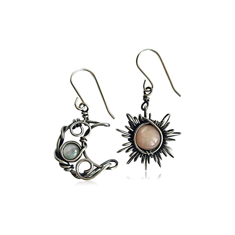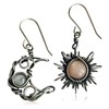 Antiqued Silver Sun and Moon Hook Earrings Bohemia Celestial Moonstone Earrings