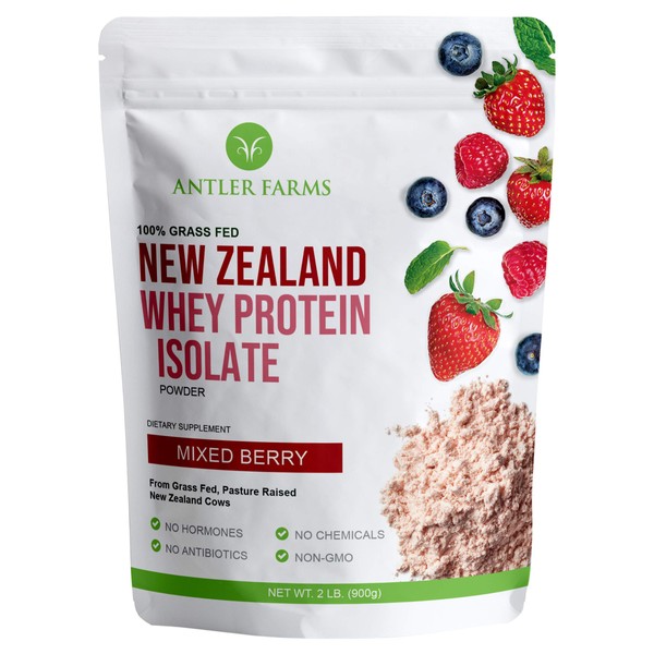 Antler Farms - 100% Grass Fed New Zealand Whey Protein Isolate, Mixed Berry Flavor, 30 Servings, 2 lbs - Delicious, Cold Processed, Rapidly Absorbed, Keto Friendly, NO-Hormones, NO-GMOs