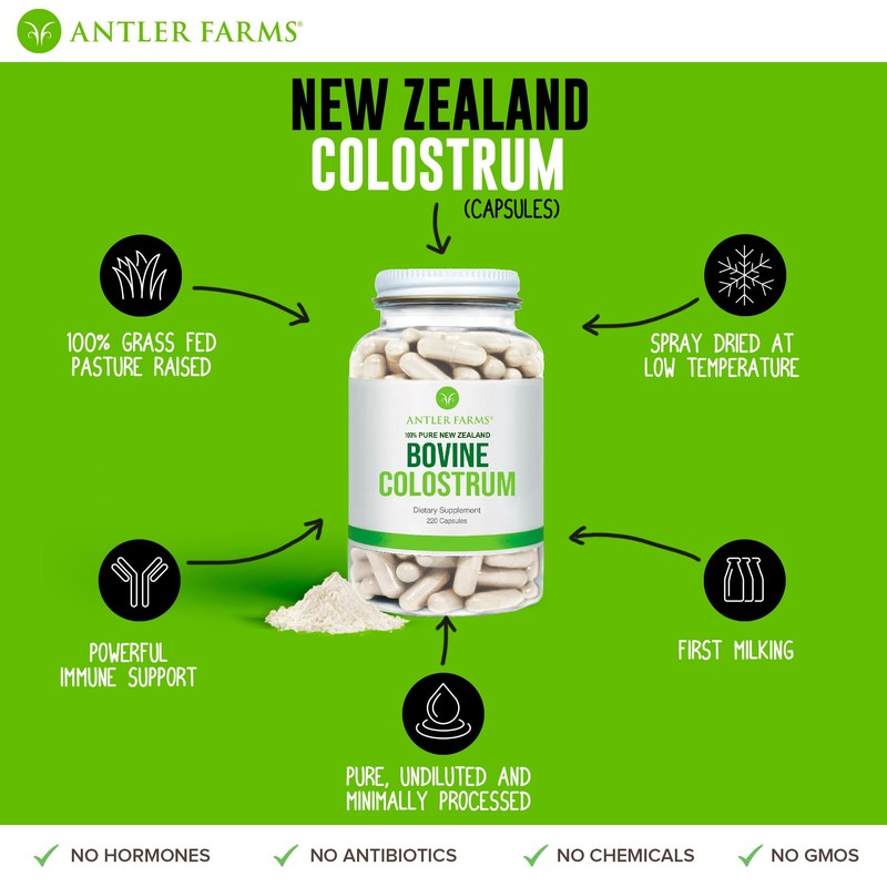 - CLEAN SOURCED - High quality colostrum begins at the source. Antler Farms New Zealand Bovine Colostrum is produced in one of the cleanest places on earth. Absolutely no hormones, antibiotics, chemicals or GMOs are used.