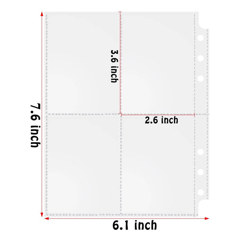 Keep your cards and photos protected! This set of A5 binder inserts includes clear 4-pocket sleeves perfect for storing trading cards, photos, memorabilia, and more. The sturdy sleeves safely hold your treasures while allowing you to easily view them in your 6 ring A5 binder.