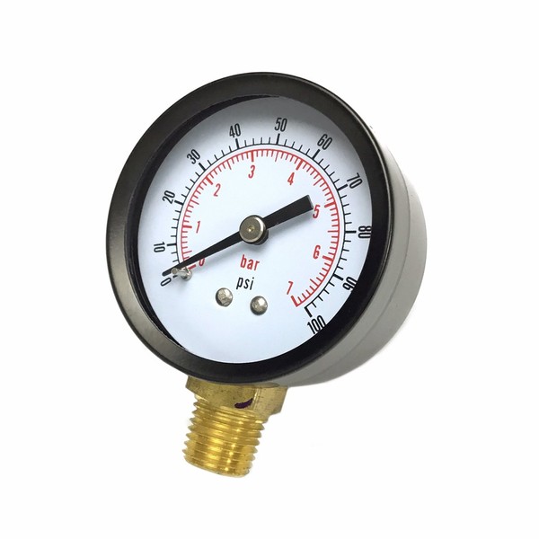 - The gauge has number markings at 0,10, 20, 30, 40, 50, 60, 70, 80, 90, 100 PSI.