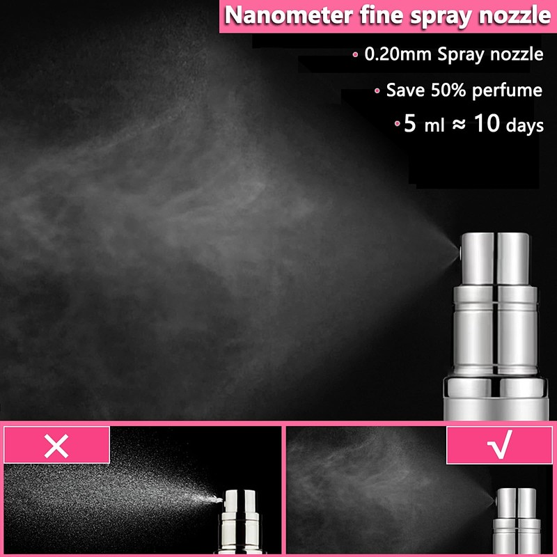- Save perfume - The spray head is made of 0.20mm nano-fine mist technology, with a fine spray and full atomization, thus saving every drop of your expensive perfume. With just 5ml of perfume, you can use it for about 10 days