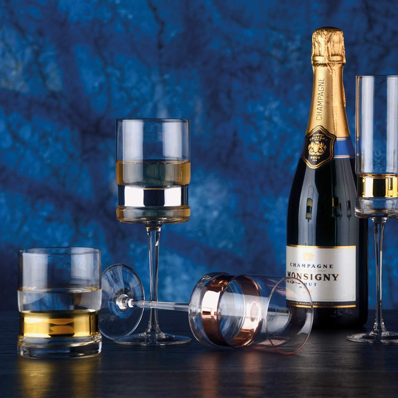 - Contemporary and stylish straight sided glasses with a bright gold band recessed within each bowl