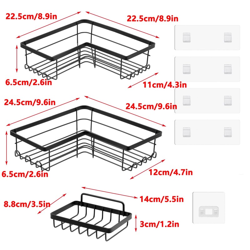 - Package Contents: 2pcs x corner shower shelves,1pcs x separate soap holder,5pcs x upgraded adhesive.