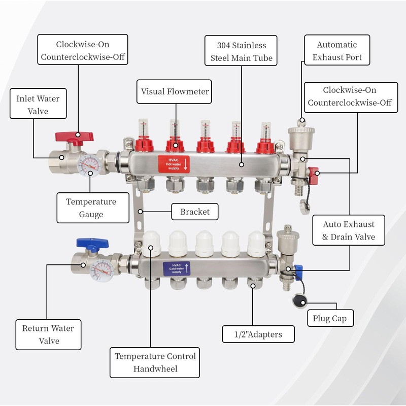 - Packaging Includes: Our radiant heat water pex manifolds is equipped with necessary accessories,such as shutoff valves,auto vent valves,temp control valves ect,to make the system more functional and controllable.