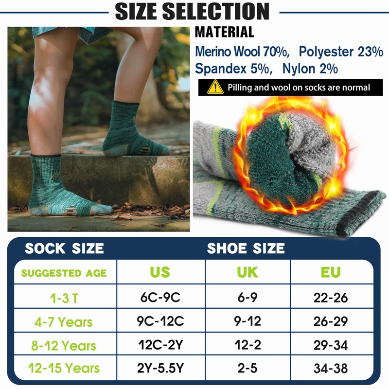 - Multiple Sizes Included: The package includes 6 pairs of Merino wool hiking socks. Available in 4 size options: 1-3T, 4-7 Years, 8-12 Years, and 12-15 Years, ensuring a perfect fit for kids of all ages.