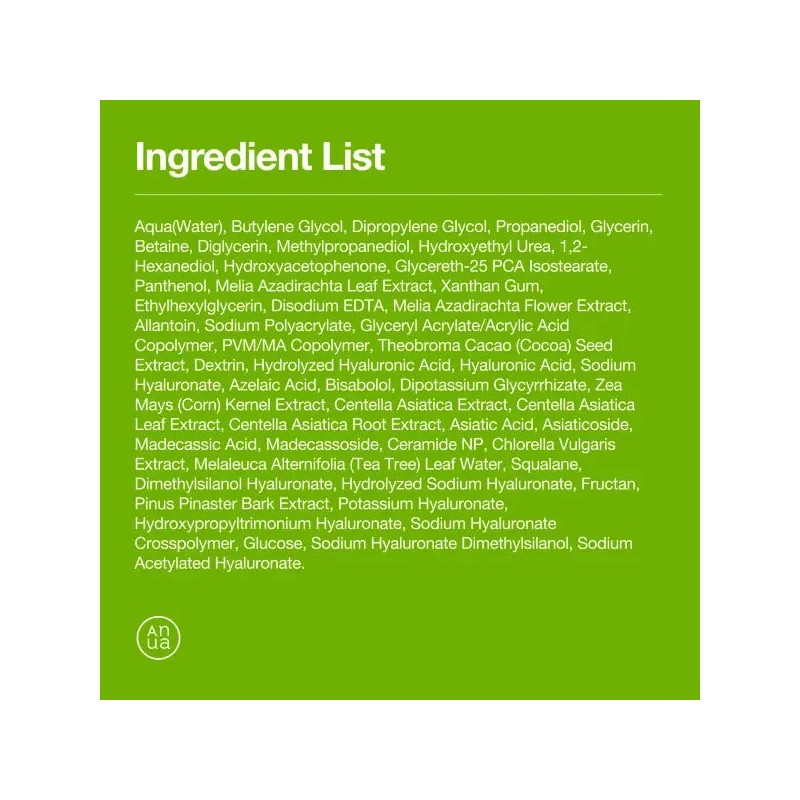Ingredients Water, Butylene Glycol, Dipropylene Glycol, Propanediol, Glycerin, Betaine, Diglycerin, Methylpropanediol, Hydroxyethyl Urea, 1,2-Hexanediol, Hydroxyacetophenone, Glycereth-25 PCA Isostearate, Panthenol, Melia Azadirachta Leaf Extrac