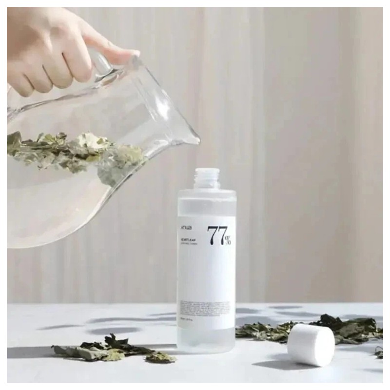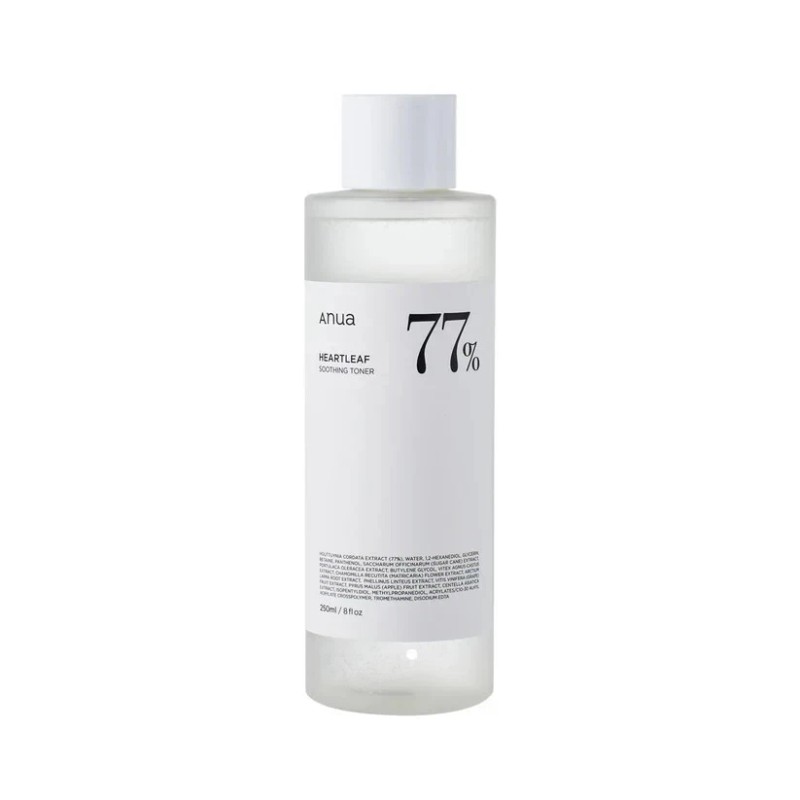 - Take an appropriate amount of the Anua Heartleaf 77% Soothing Toner onto a cotton pad or onto your fingertips.
