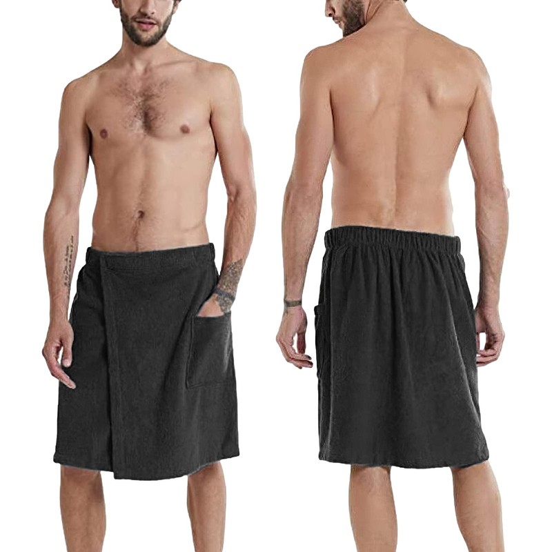 ANUFER Mens Adjustable Bath Towel Wrap - Wearable Towel Skirt with Pocket for Gym Shower Sauna Spa & Beach Cover Ups Black S