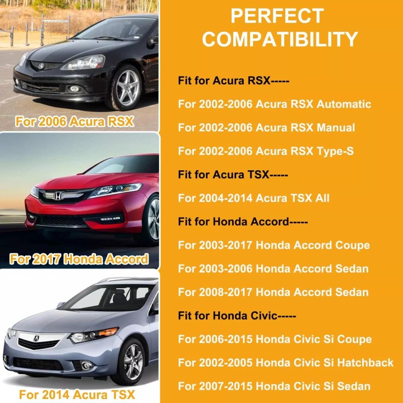 2.??Perfect Compatibility??Compatible with 2002-2006 Acura RSX Automatic, 2002-2006 Acura RSX Manual, 2002-2006 Acura RSX Type-S, 2004-2014 Acura TSX All, 2003-2017 Honda Accord Coupe, 2003-2006 Honda Accord Sedan, 2008-2017 Honda Accord Sedan, 2006-2015 Honda Civic Si Coupe, 2002-2005 Honda Civic Si Hatchback, 2007-2015 Honda Civic Si Sedan.