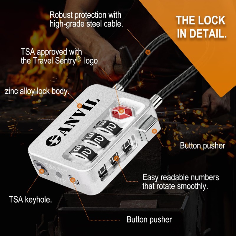 - Aprobado por la TSA con función de alerta de búsqueda: los candados de cable aprobados por la TSA de ANVIL cuentan con un sistema único de alerta de búsqueda, proporcionando una notificación inmediata cuando tu equipaje se somete a inspección Cumple con las normas TSA, estas cerraduras garantizan controles de seguridad sin complicaciones durante tus viajes.