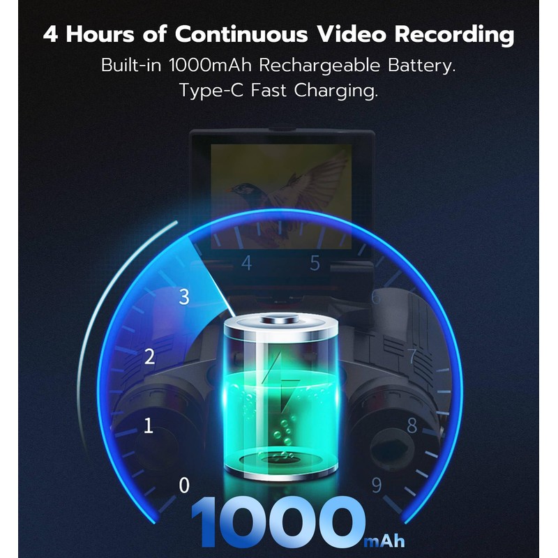 - 【Long-Lasting Rechargeable Battery】 Built-in 1000mAh lithium battery supports up to 4 hours of continuous video recording. Enjoy uninterrupted outdoor exploration without worrying about running out of power. And fast charging through USB-C.