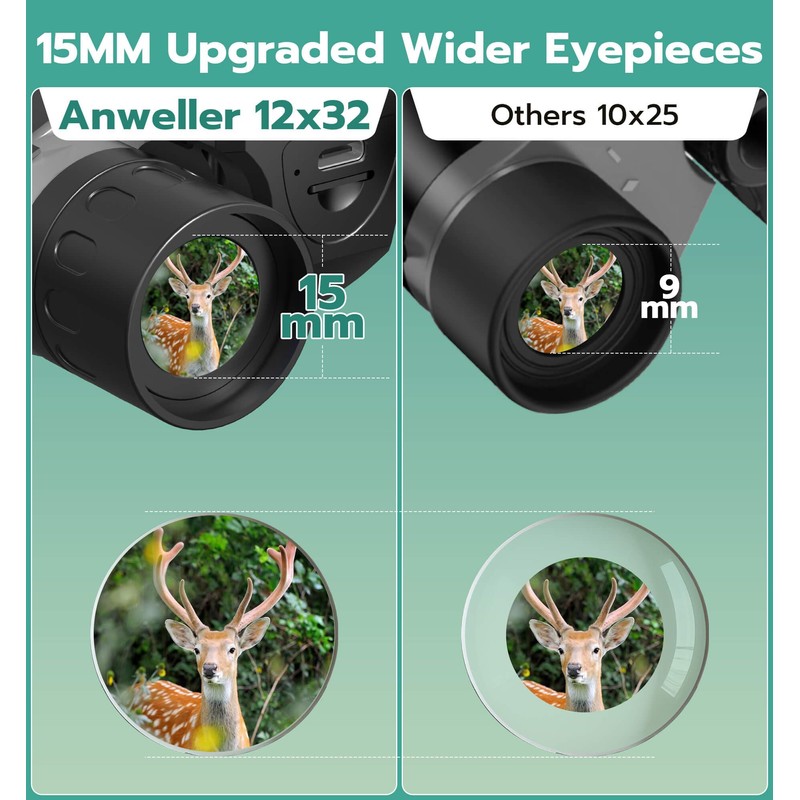 - 【12x32 High-Powered Binoculars】 Our binoculars feature a high magnification 12x zoom, 32mm objective lens, 15mm upgraded wider eyepieces, viewing distance of 1100 yards, letting you look farther and see wider. Coating with FMC Broadband coating and premium BAK4 prism to ensure imaging verisimilar.