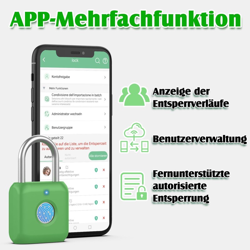 • Smart holiday gift: Say goodbye to cumbersome password combinations. You can only unlock the smart lock for a fraction of a second with your finger. Don't worry about losing the key or forgetting the password. The fingerprint padlock can register up to 15 sets of fingerprints. You can also authorize the lock and share it with your family/friend to use it.