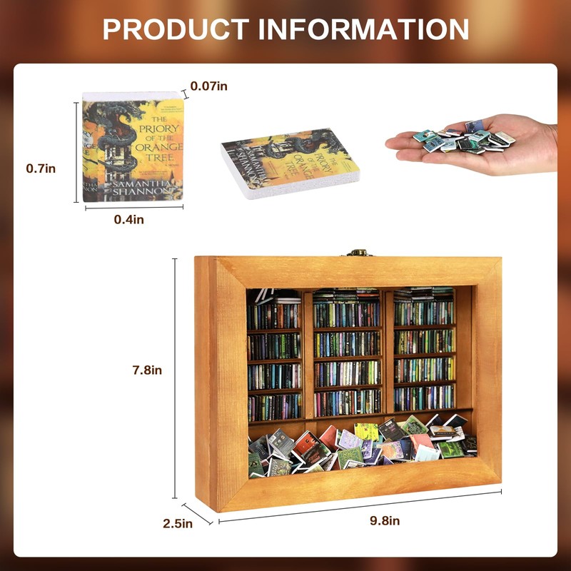 - Small and Stylish: the size of this mini bookshelf is 9.8*7.8*2.5 inches, the size of the mini book is 0.7*0.4*0.07 inches, explore 400 miniature books, and build a miniature bookshelf